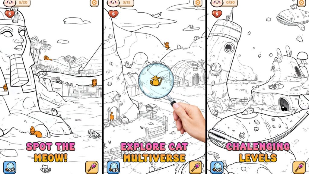 - Mejora la atención y la concentración: Agudiza tu capacidad de observación 🔍mientras buscas gatos en entornos llenos de detalles.😄